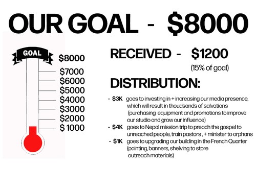 To get your copy, we ask that you give an offering of any amount to the ministry. There is no set amount, but right now we have a goal of raising $8000 (breakdown below), and we are at 15% of that goal.